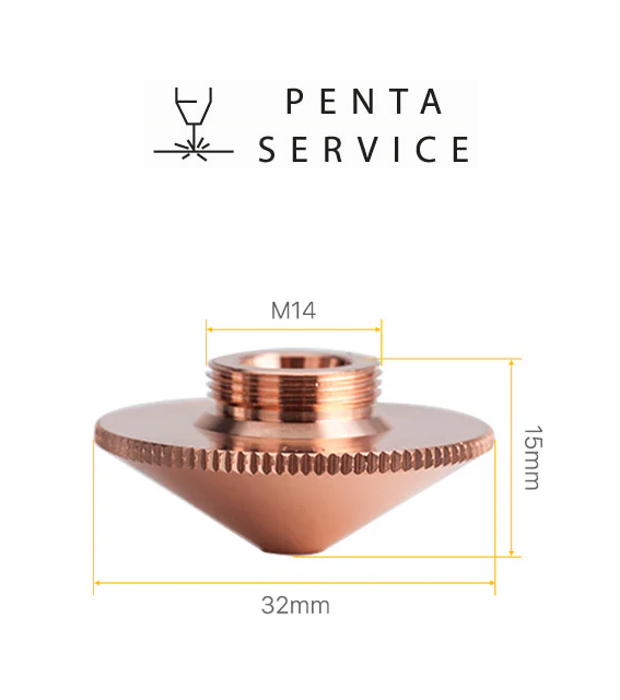 Сопло PENTA SERVICE высотой 15 мм, диаметром 32 мм, имеет диаметр отверстия 1,5 мм и резьбу М14, произведено из меди с соблюдением всех необходимых стандартов качества, технических и геометрических параметров изделий данного типа. В результате применения, сопло гарантирует сохранение расчётных параметров в течение длительного времени и обеспечивает высокую мощность работы оборудования лазерной резки.